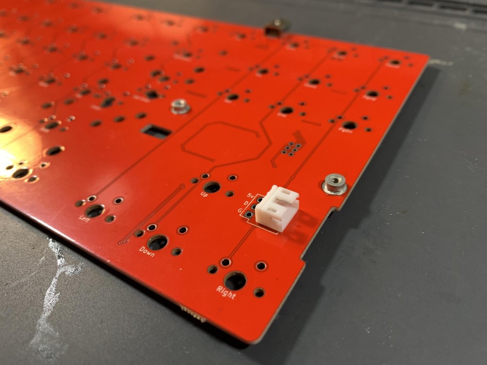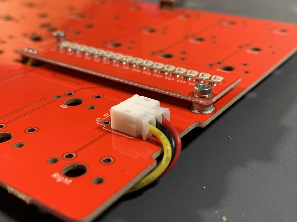 Guide the wire attached to the daughterboard along the underside of the PCB, utilizing the small cutout in the side of the PCB to plug the JST cable into the header soldered in step 3.