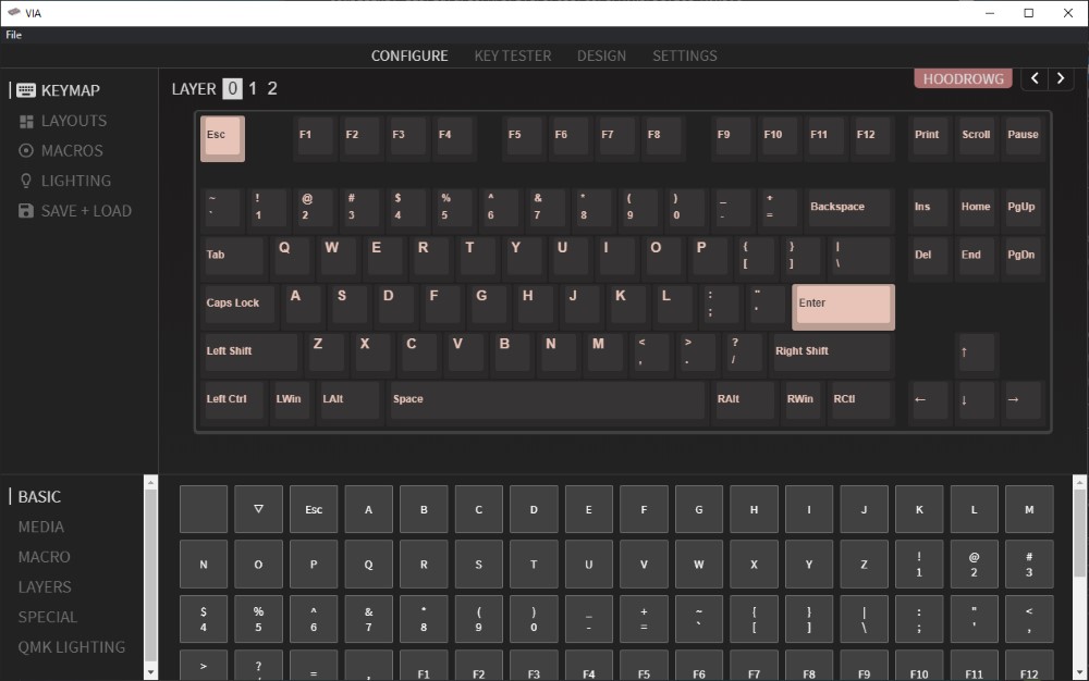 Navigate to the configure tab, you should see the PCB now viewable in the configure tab! At this point you can now remap your keyboard in real time using VIA. It is recommended to save your layout using the interface once you have your layout setup. This will allow you to quickly access your current layout should you want to change something.