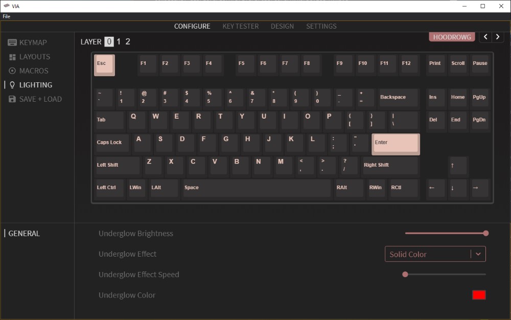 Navigate to the configure tab, you should see the PCB now viewable in the configure tab! At this point you can now remap your keyboard in real time using VIA. It is recommended to save your layout using the interface once you have your layout setup. This will allow you to quickly access your current layout should you want to change something.