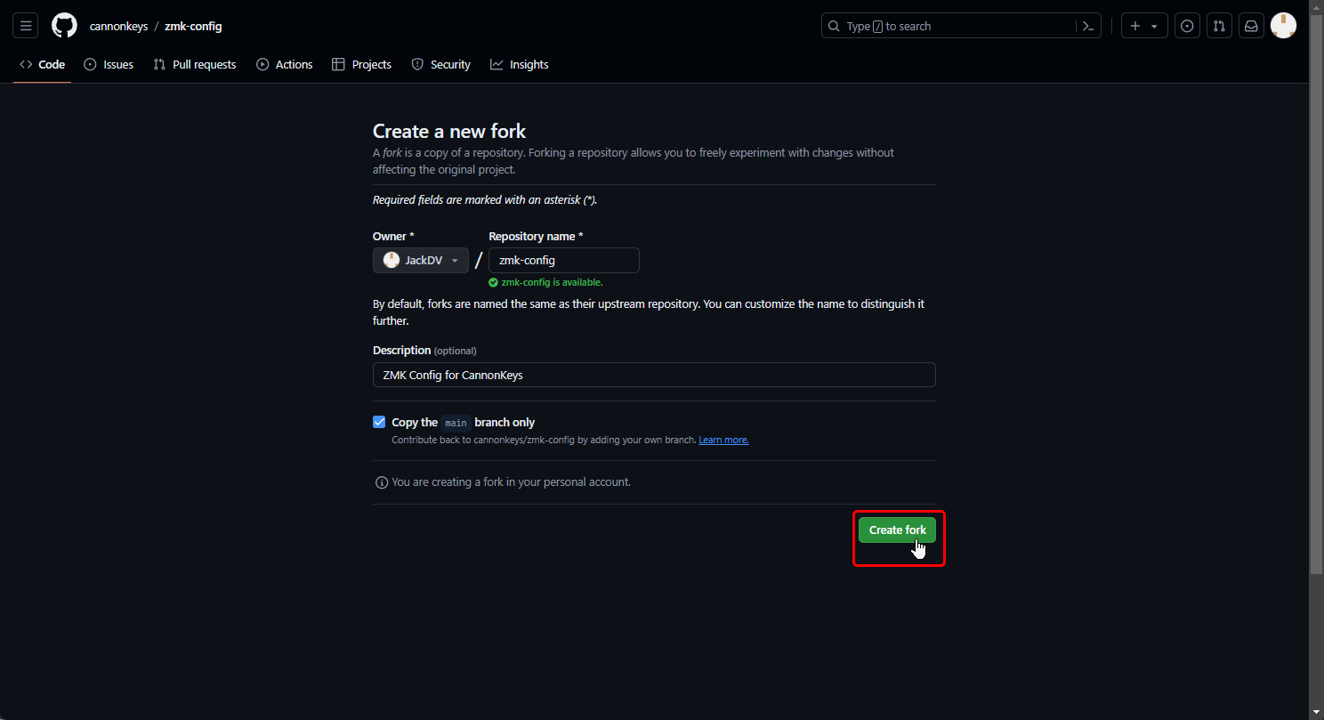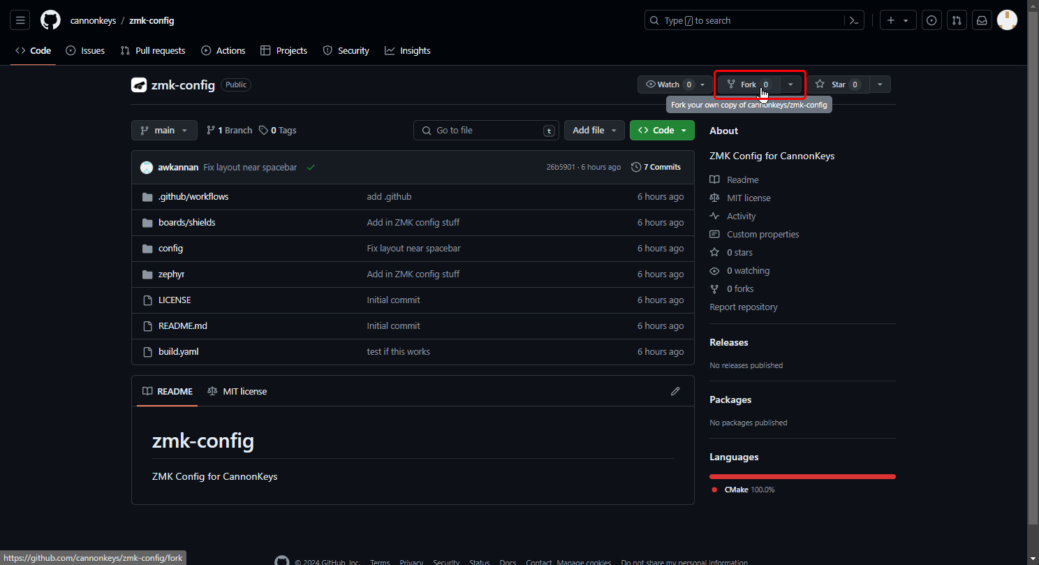 Keep the configurator page open, but in a new tab/window log into your GitHub account, and navigate to the CannonKeys zmk-config repo. Click the fork button in the top right of your screen.