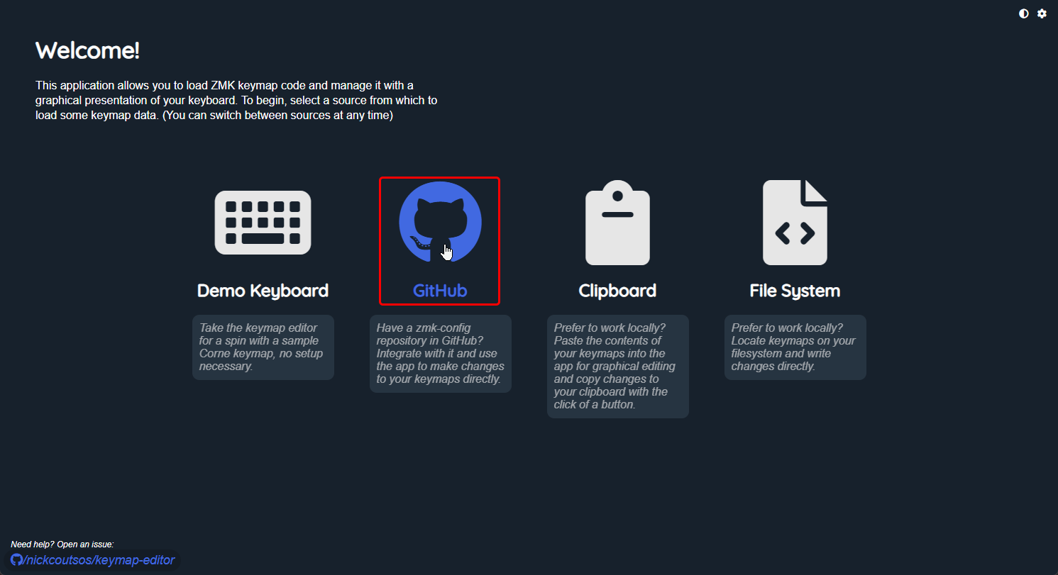 Let's start by linking your GitHub account to the ZMK configurator website. Navigate to the keymap editor website, and click the GitHub icon to link your GitHub account to this site.