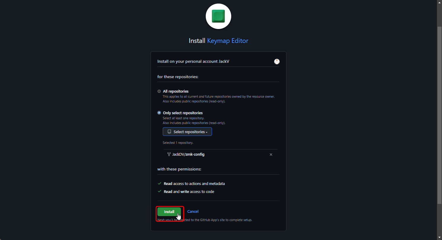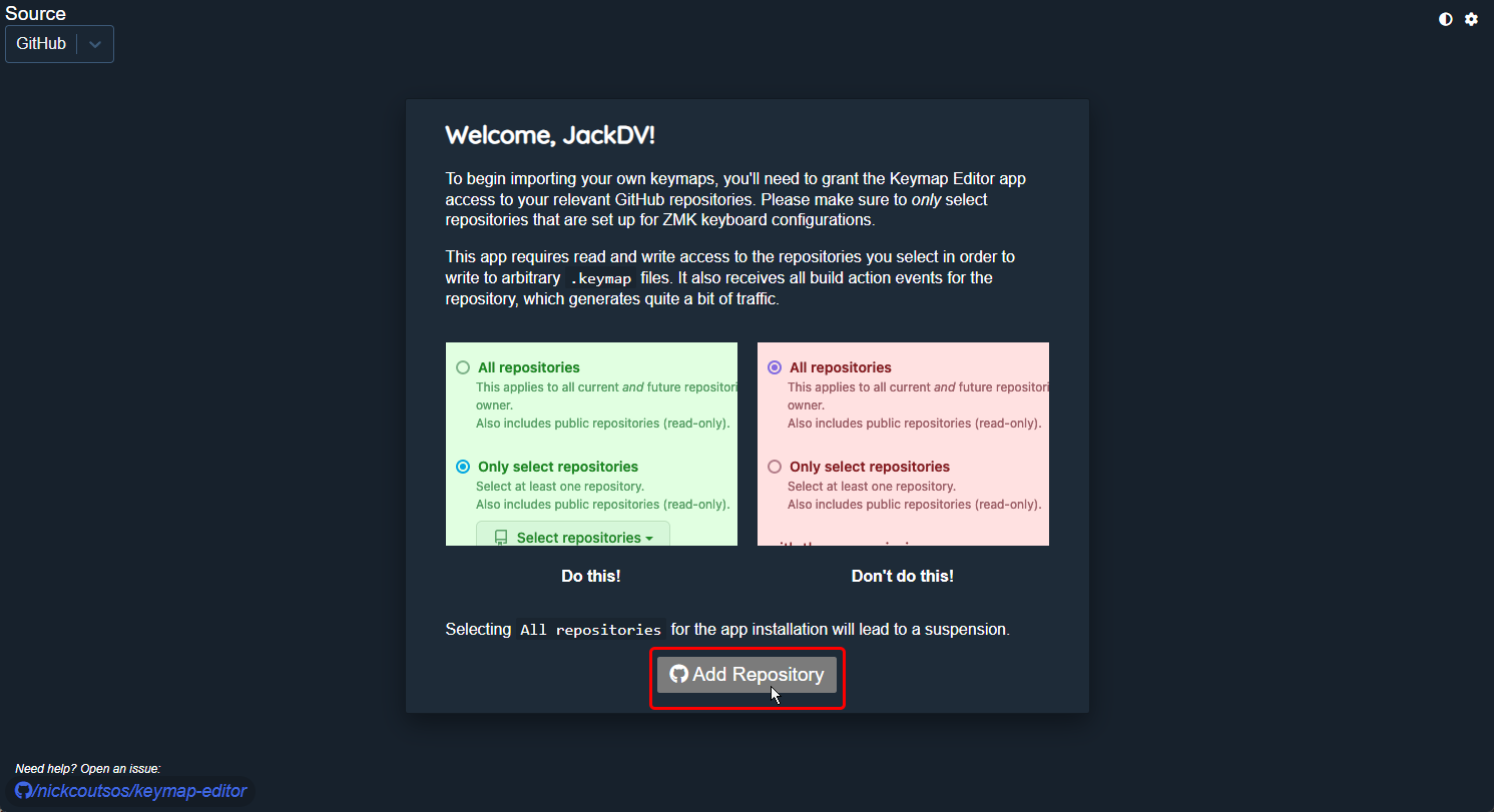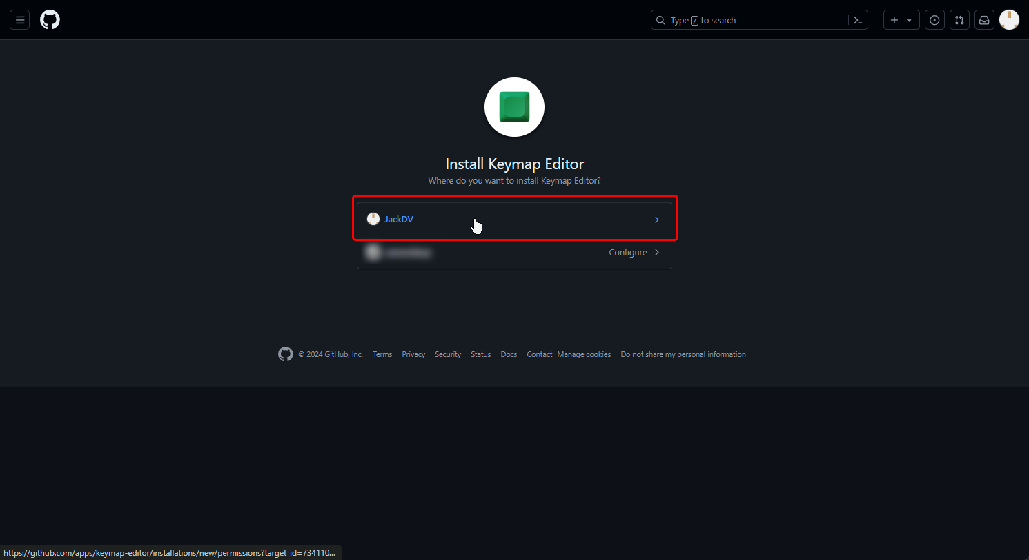 Select the GitHub account you plan on using for this. Your GitHub account should now be linked to the keymap editor!
