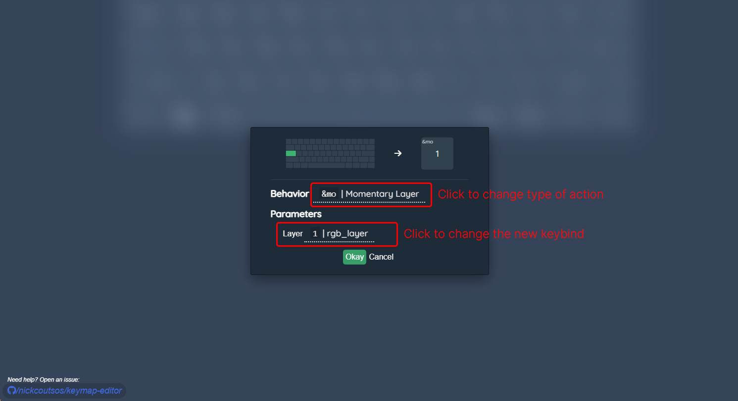 A dialogue box will pop up. The top option is where you decide what type of action you want this key to do. This is referred to as the key behavior. The bottom dropdown is where you set the new keybind. You can find a list of keycodes here, or you can use the interface in the editor to search. We have some basics listed in our user guide if you need help.