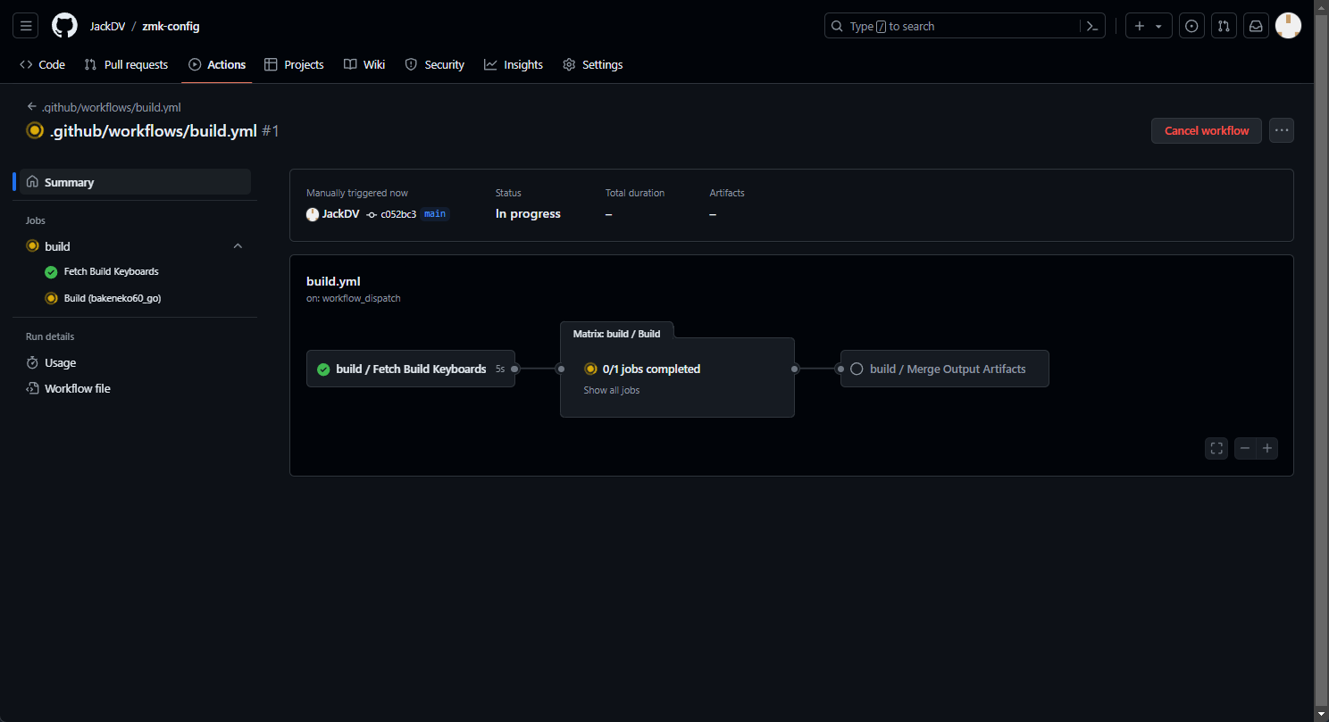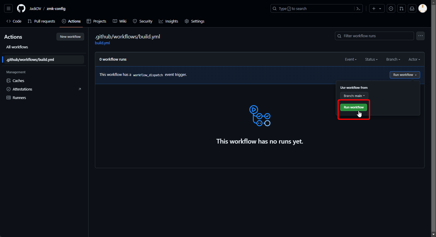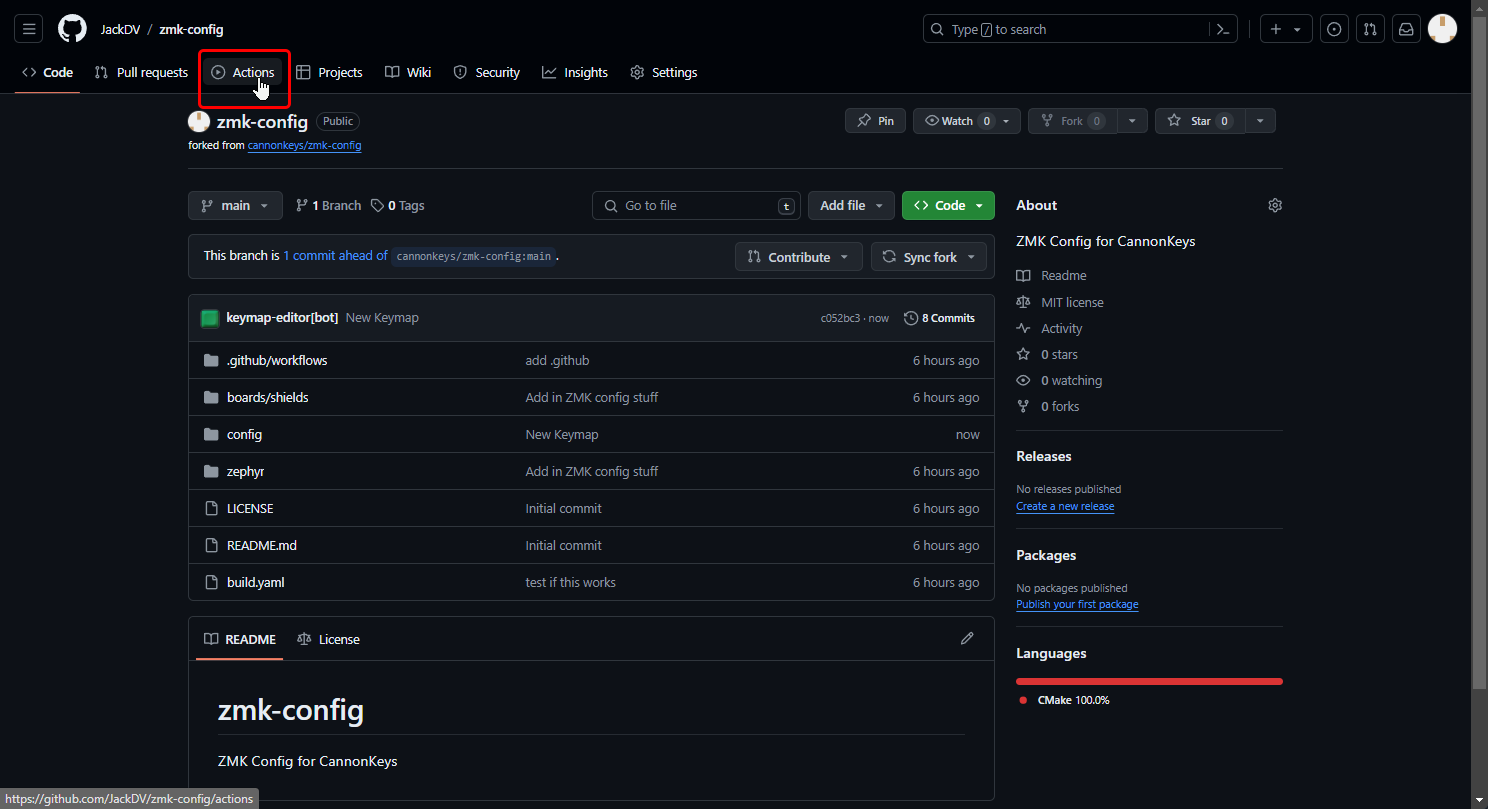 github.com/yourusername/zmk-config. You can tell your changes were applied if you see a recent change in your repo. Click on the actions button.