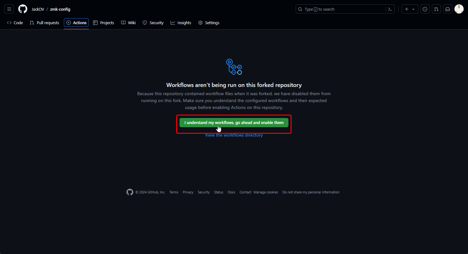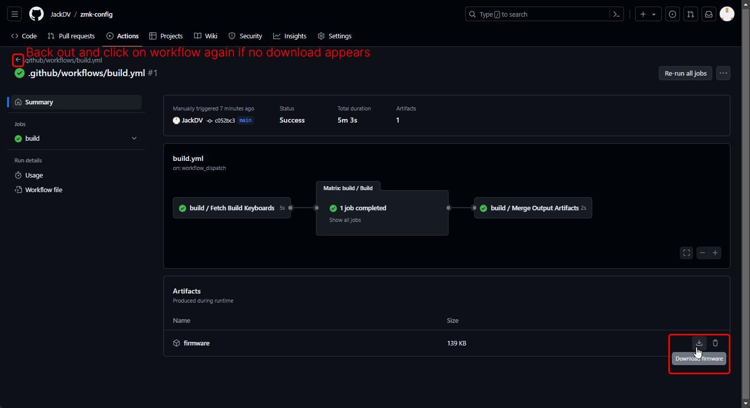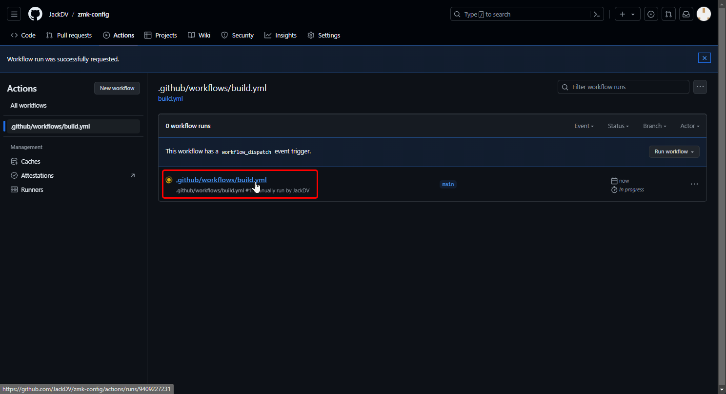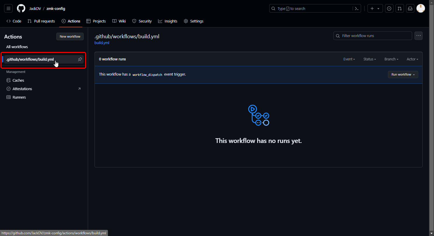 github.com/yourusername/zmk-config. You can tell your changes were applied if you see a recent change in your repo. Click on the actions button.