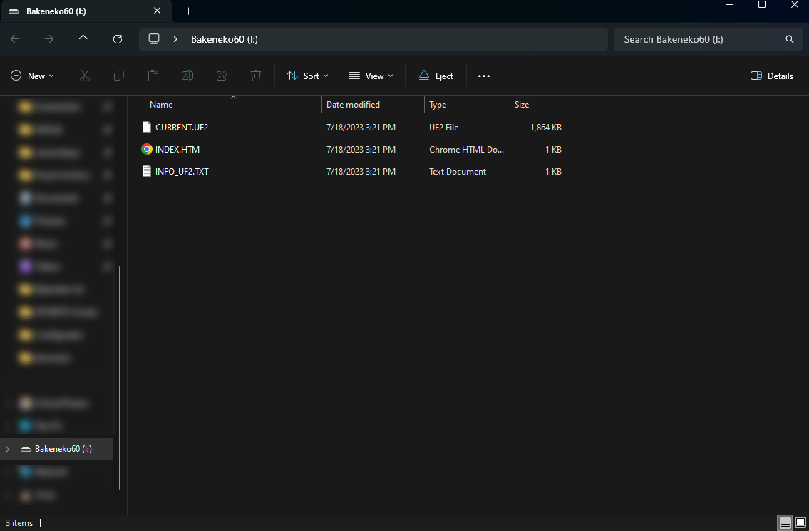 Bakeneko60. This folder represents the storage found on your BakenekoGO PCB, and can be found as a removeable storage in file exporer if accidentally closed. If you are on a Mac, the drive will mount and be visible on your desktop as well as the Finder sidebar as Bakeneko60.