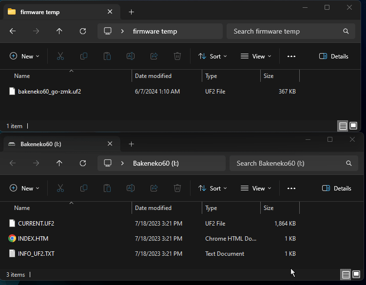 Bakeneko60drive/folder. The firmware should be calledbakeneko60_go-zmk.uf2. If you get an error, unplug your keyboard/PCB, plug it back in, and try again. If successful, the firmware file will copy into the BakenekoGO, the folder will close, and your BakenekoGO will now have your new keymap!