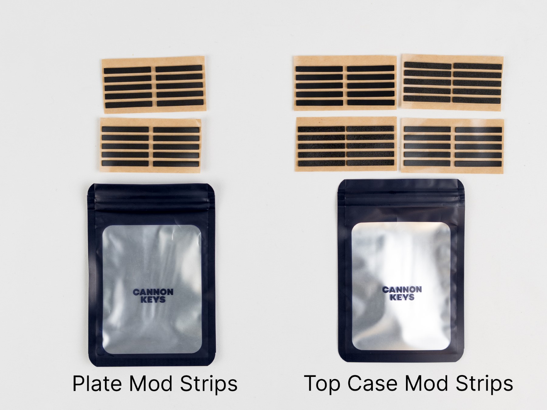 Plate mod strips are attached to the top and bottom of your plate instead of O-rings, should you wish to use them. Top Case Mod Strips are gasket strips that get attached to the top of the case, not bottom. These all have a light adhesive to encourage trying out different combinations to figure out what you like best!