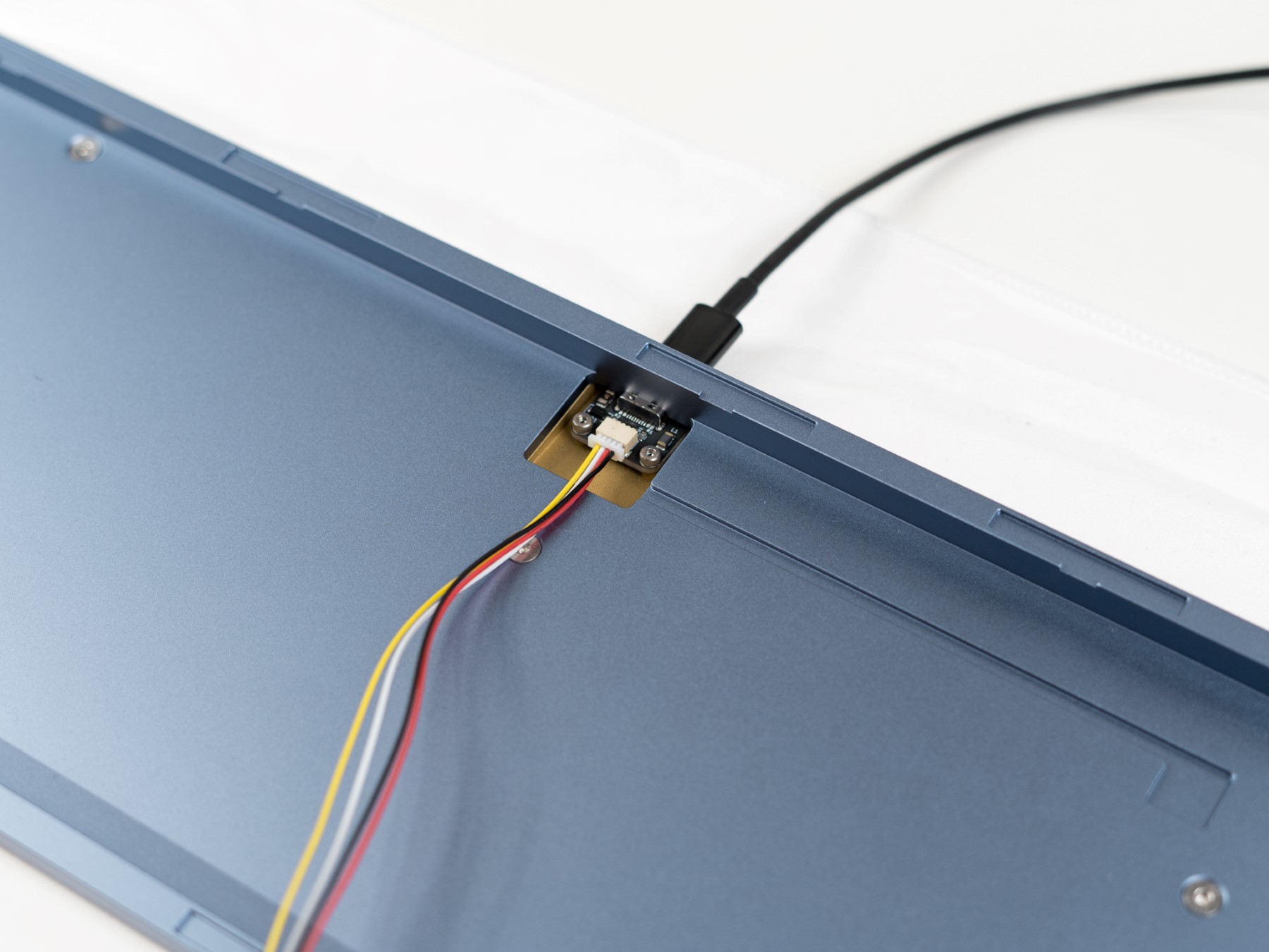 1. Now that you have tested that the PCB is working, remove the JST cable from the PCB, but keep it installed on the daughterboard. Flip the bottom case over and using the 4 small daughterboard screws, install the daughterboard ensuring the USB Type-C connection is aligned with the cutout on the back of the case.