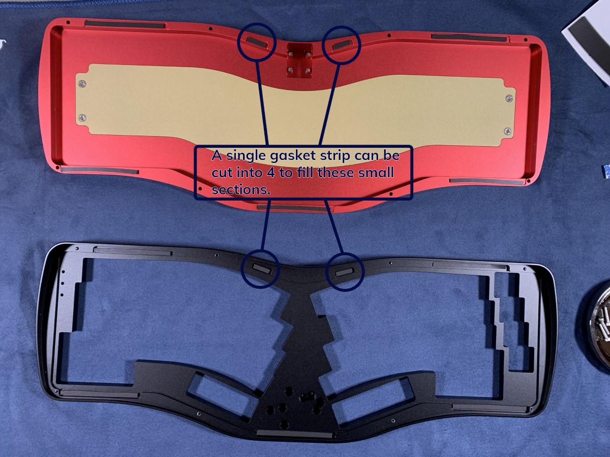 2. Now that your PCB + plate assembly is soldered we can move onto the case! Grab the gasket strips, and start applying them to the top and bottom of the case. There are 4 sections of the case that require smaller strips. These 4 pieces can be cut from 1 longer piece, as seen in the image below. Don't worry about perfect placement, as long as the strip is making full contact in the area you should be good to go!