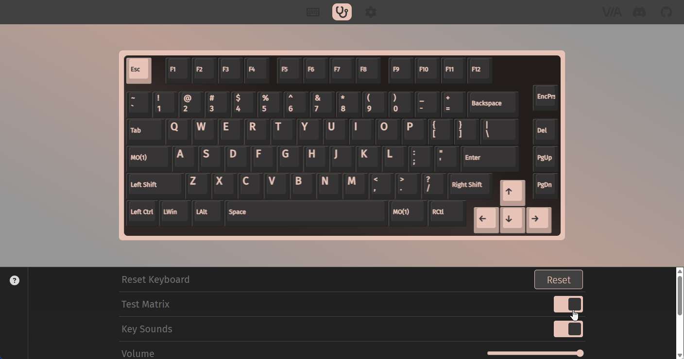 Once connected, navigate to the key tester tab. Toggle the test matrix button in the interface.