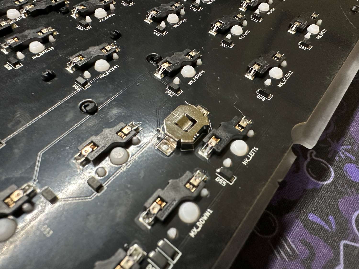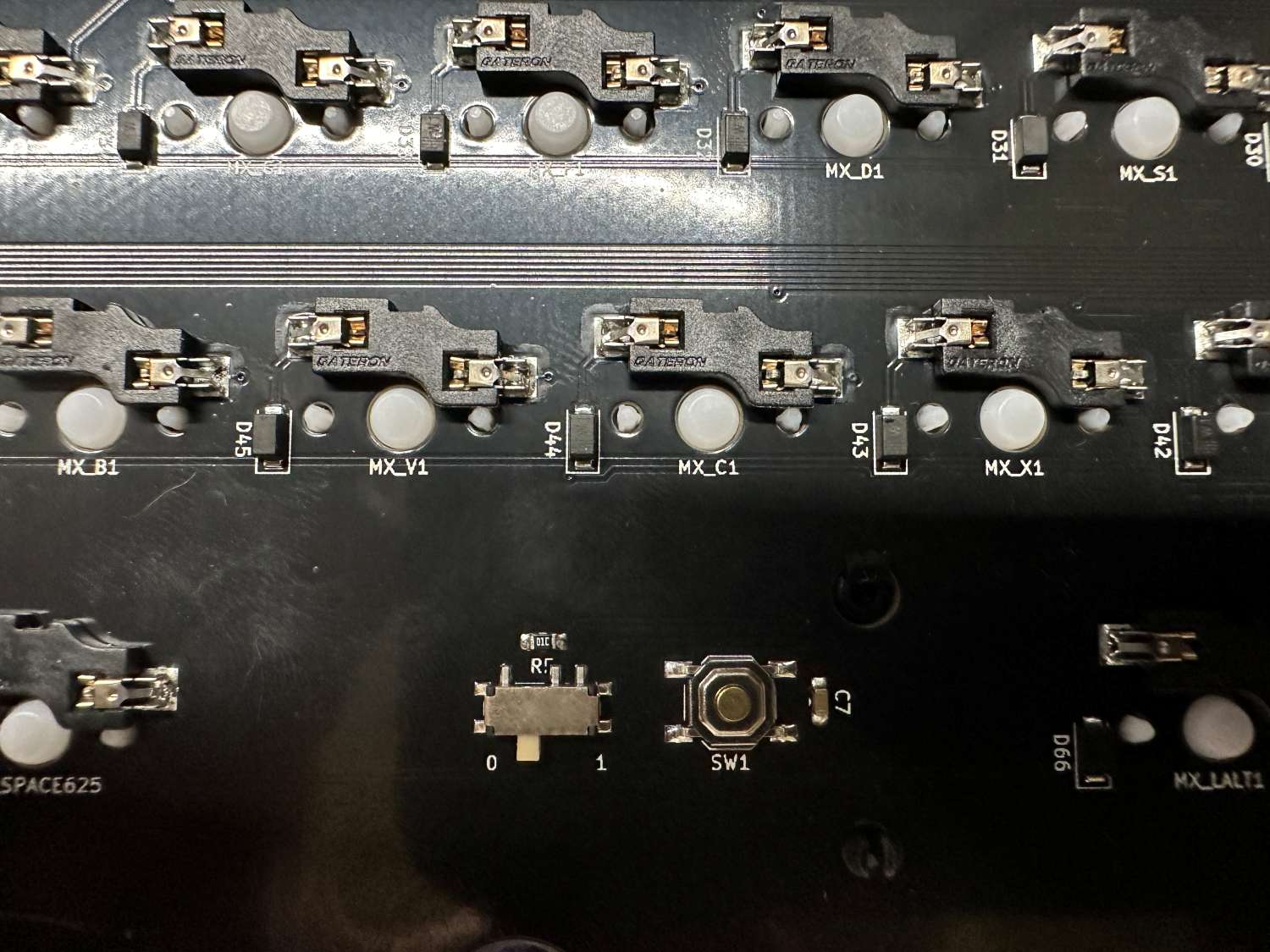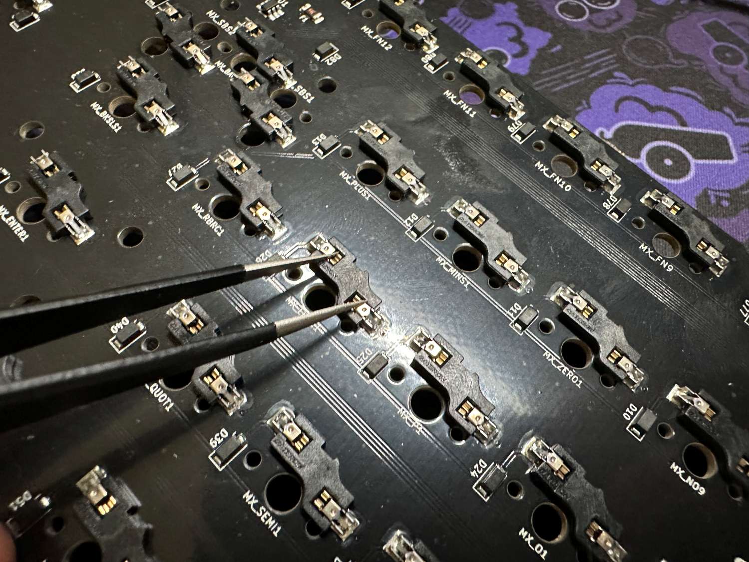 Using tweezers, bridge the metal pads on the underside of the hotswap sockets to test each switch. If you don't have tweezers, other metal objects such as a bent paperclip or a bit of wire can work. Once you've confirmed each socket is working, you can continue into the next section.