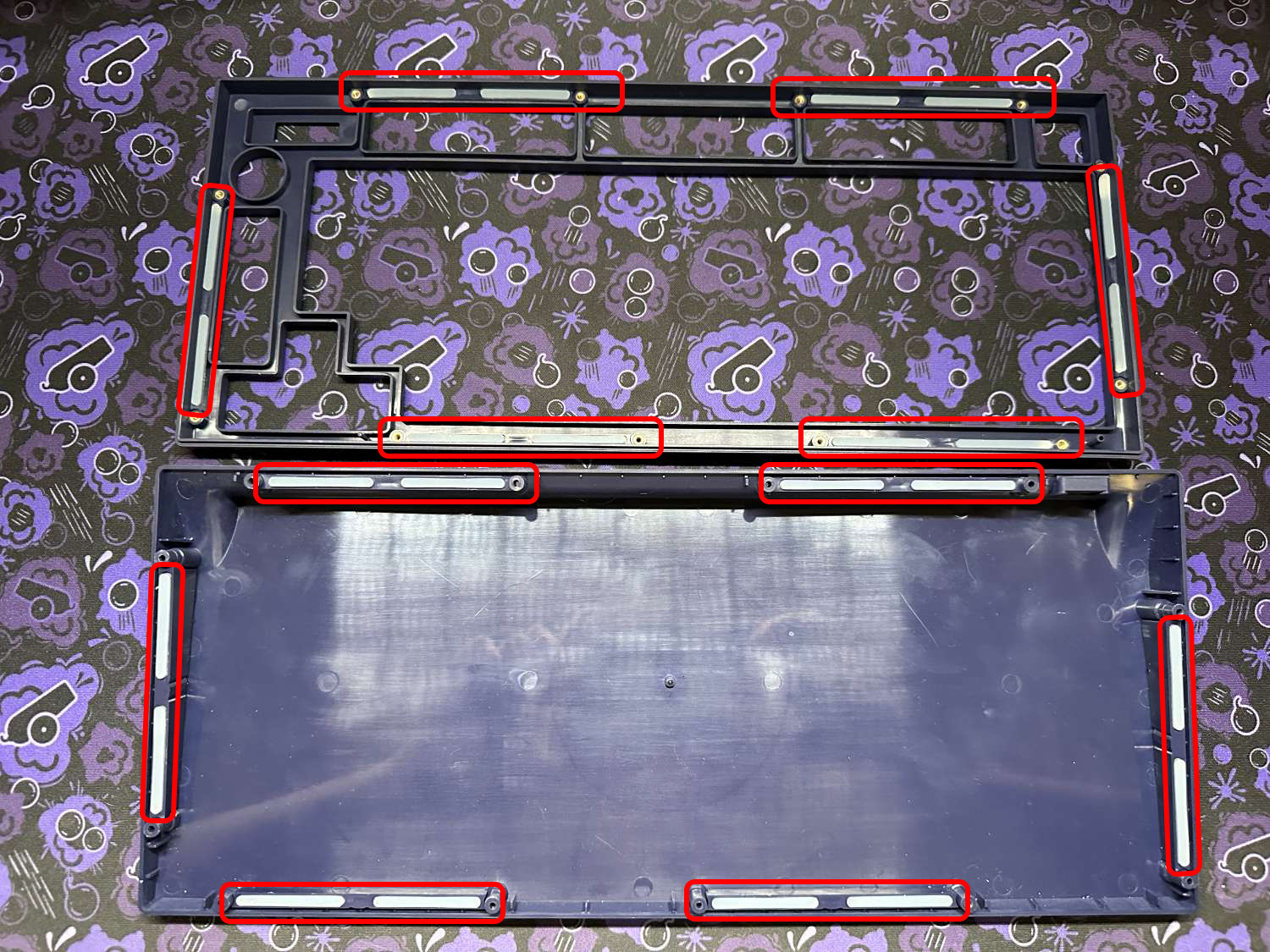 If your case is screwed together, unscrew the 12 hex screws, and separate the top and bottom. Into each of the 24 little pockets, install the gaskets. If you look closely, you will notice that each of the little case pieces where you're installing the bottom gaskets is actually removeable. While this does allow for further customization, for your first build we recommend leaving all of them installed.