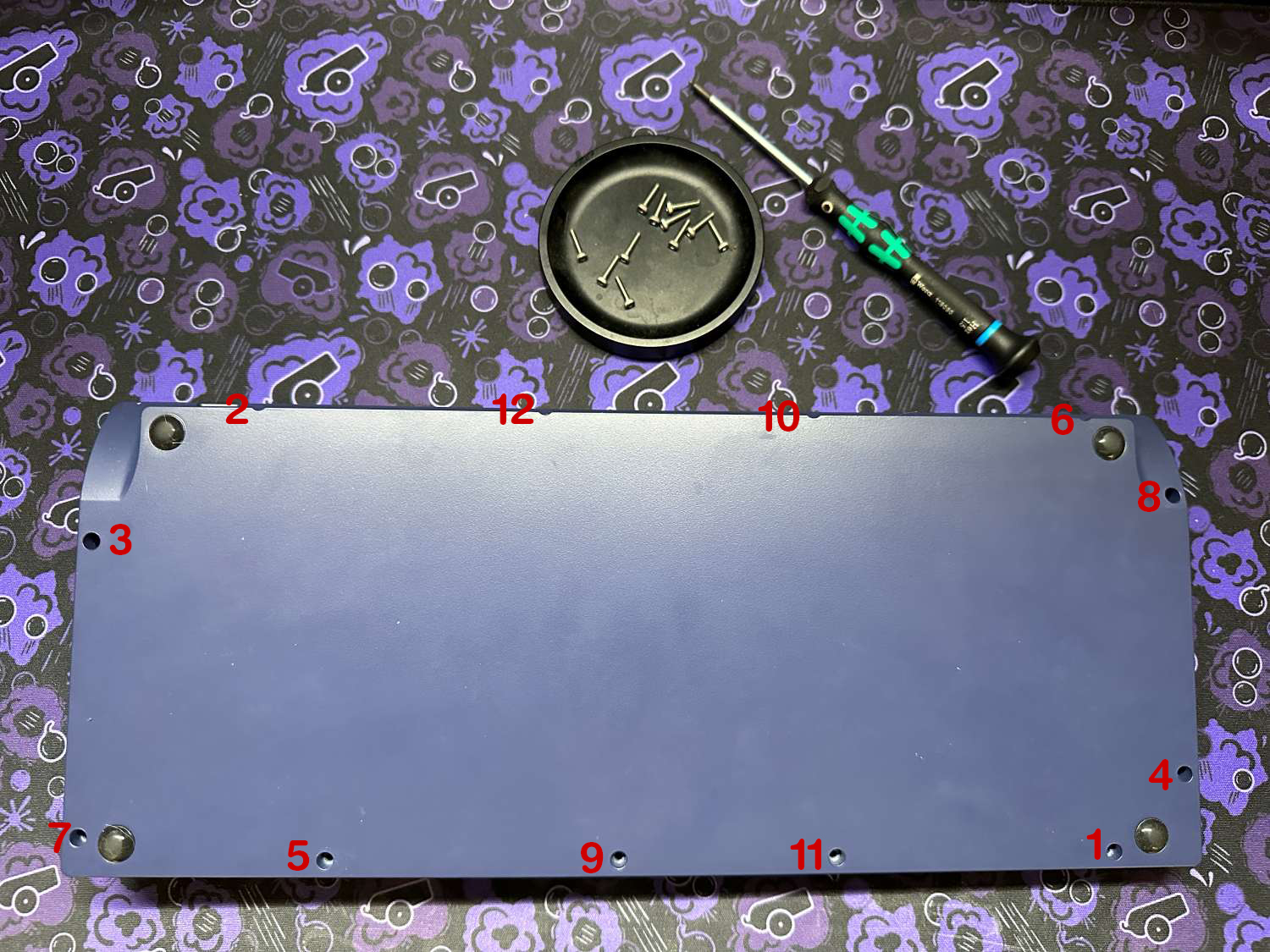 With everything installed, flip over the case and install the 12 hex screws. To help avoid case warping and achieve a more even gasket compression, install screws opposite eachother in a criss-cross pattern as seen below. You don't need to tighten these too much - we recommend stopping once you start to feel resistance.