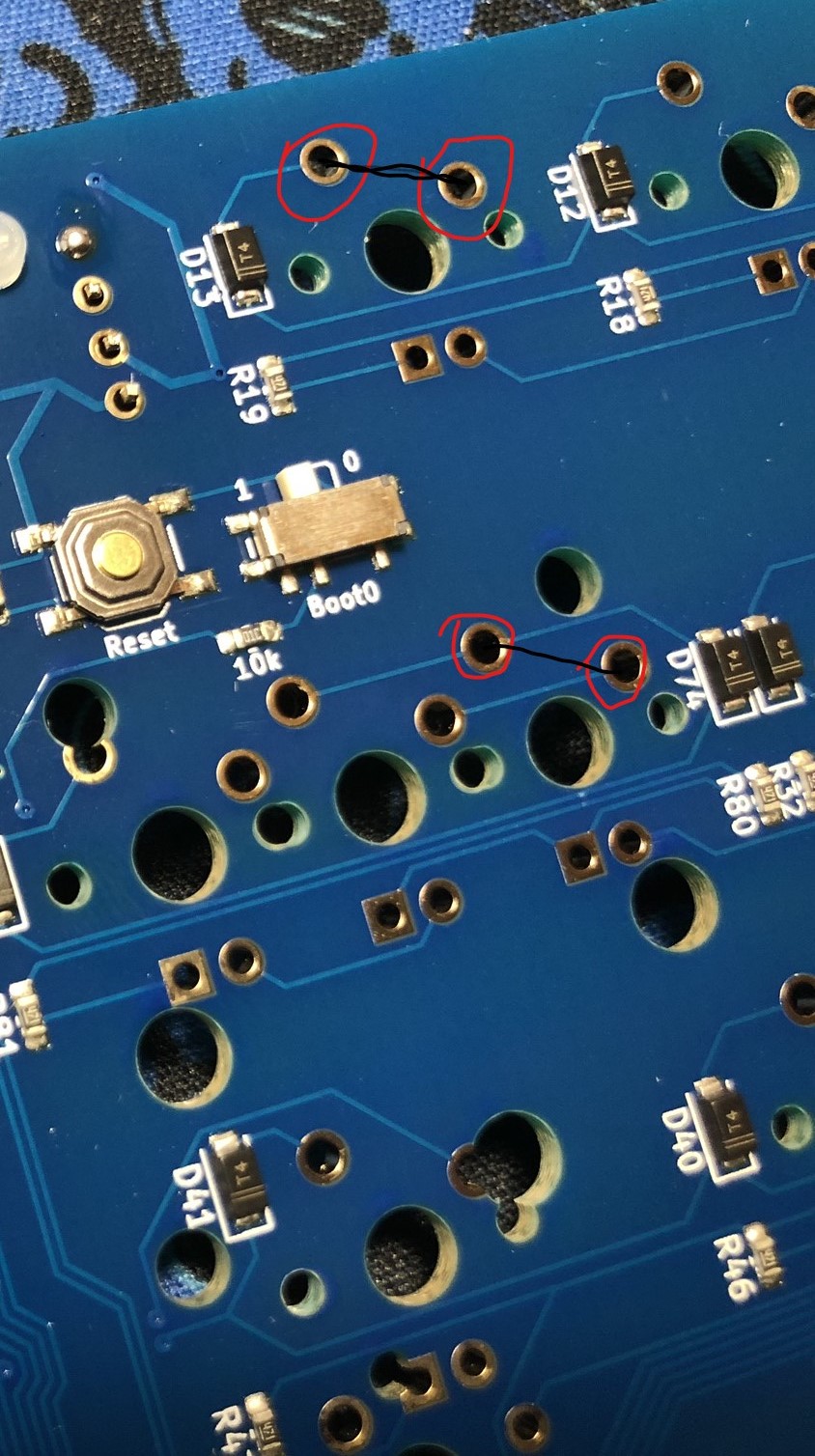 Touch a conductive piece of material to each pair of switch holes (examples circled in red). Ensure that a keypress is registered on the tester.