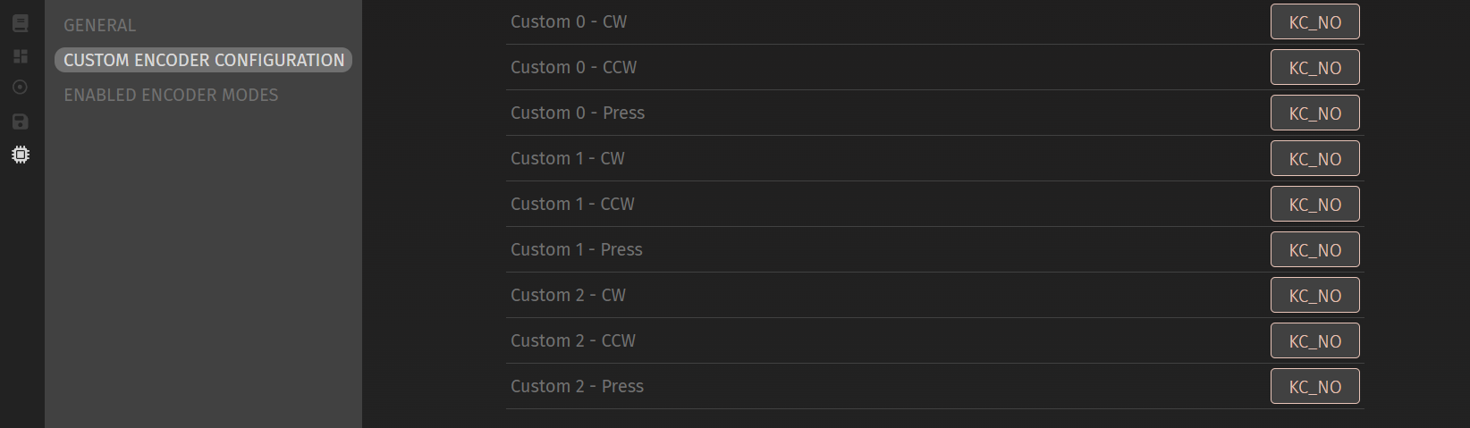 Each box controls a different behavior in the custom encoder mode, and can be defined with a QMK keycode.
