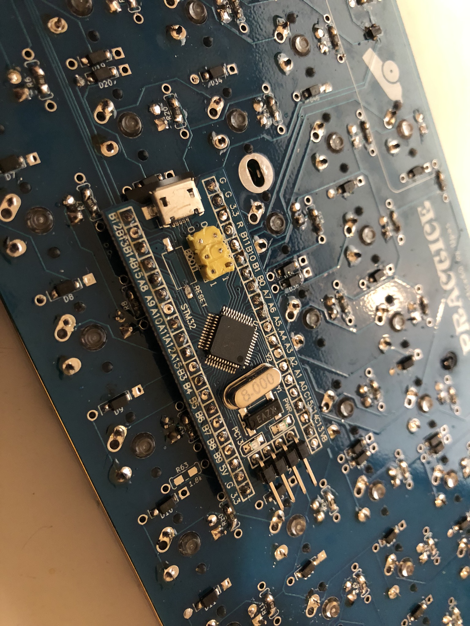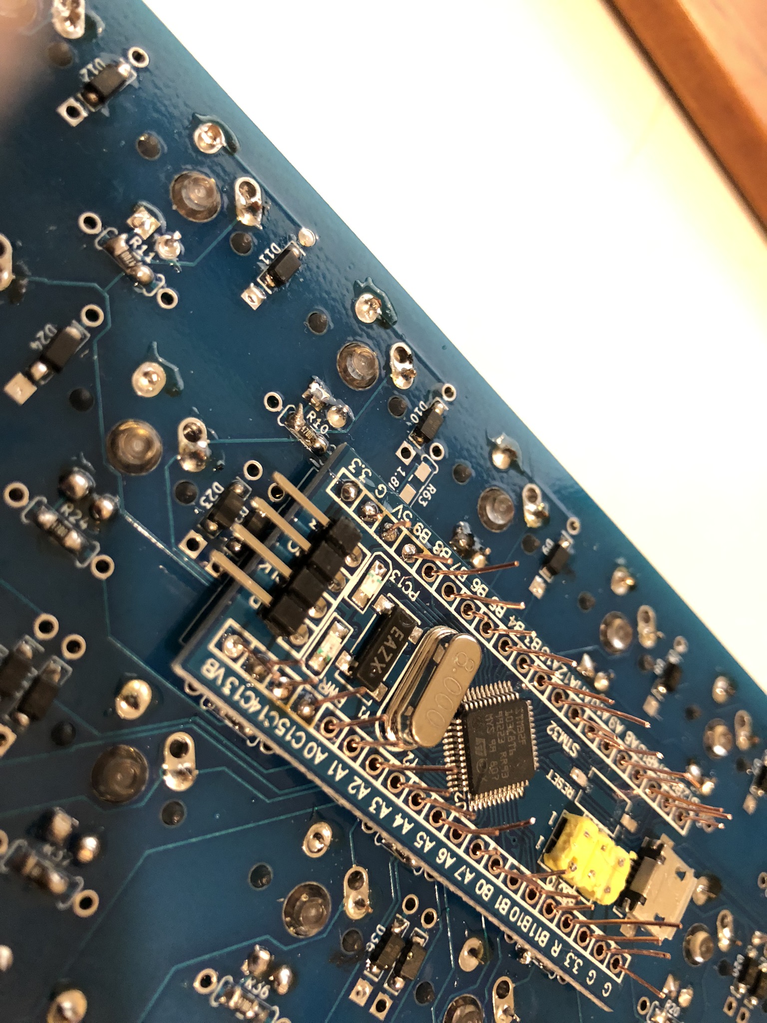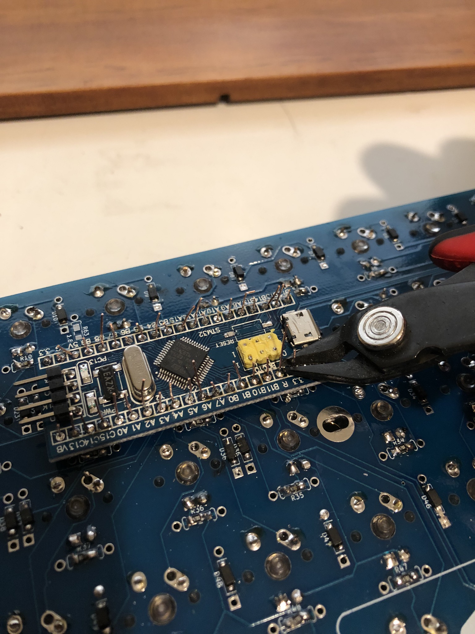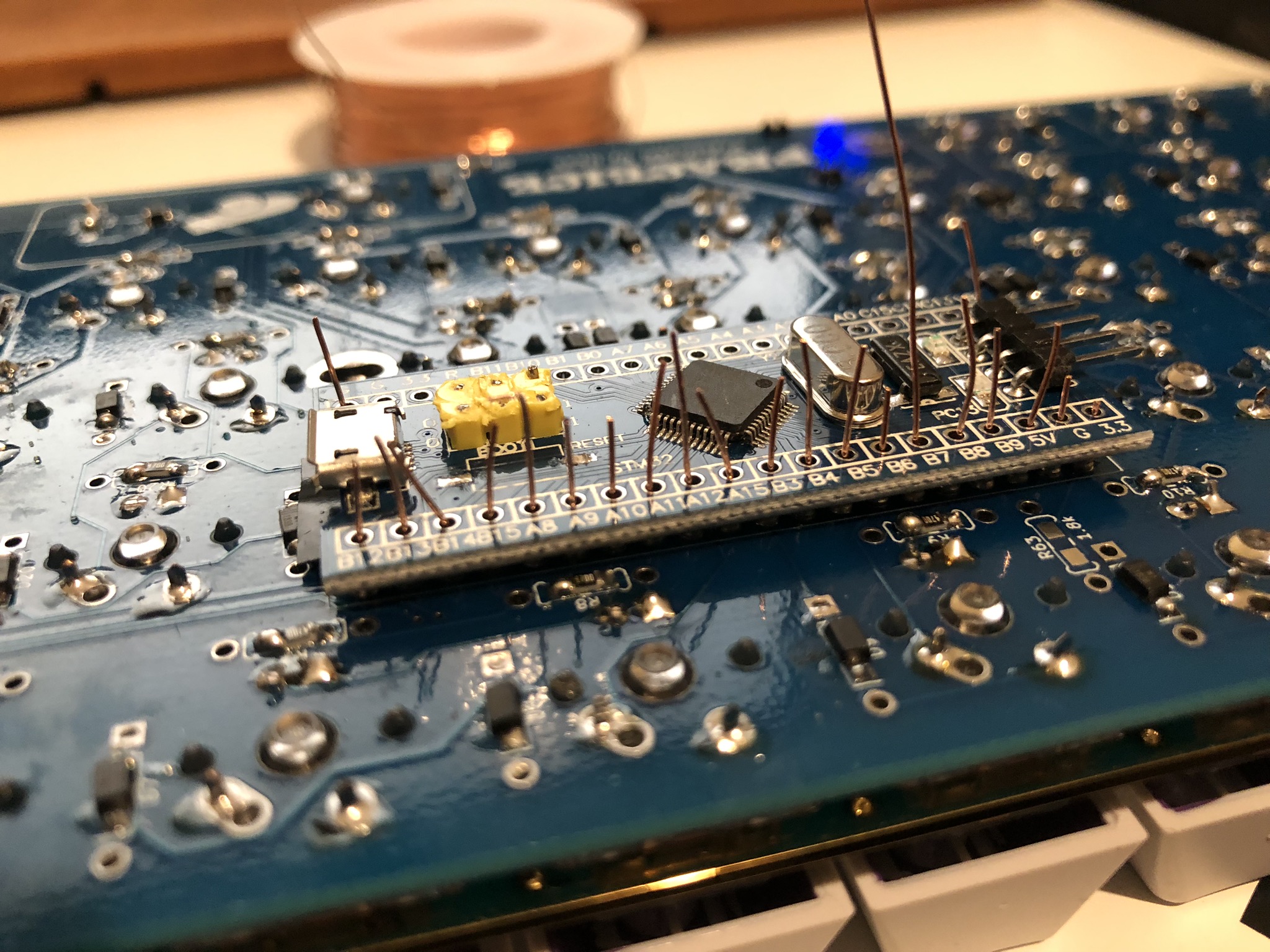 Some of these photos were taken using a Pro Micro based Luddite board. The same steps apply, just on your blue pill based board! You have 20 spots on each side, not 12.