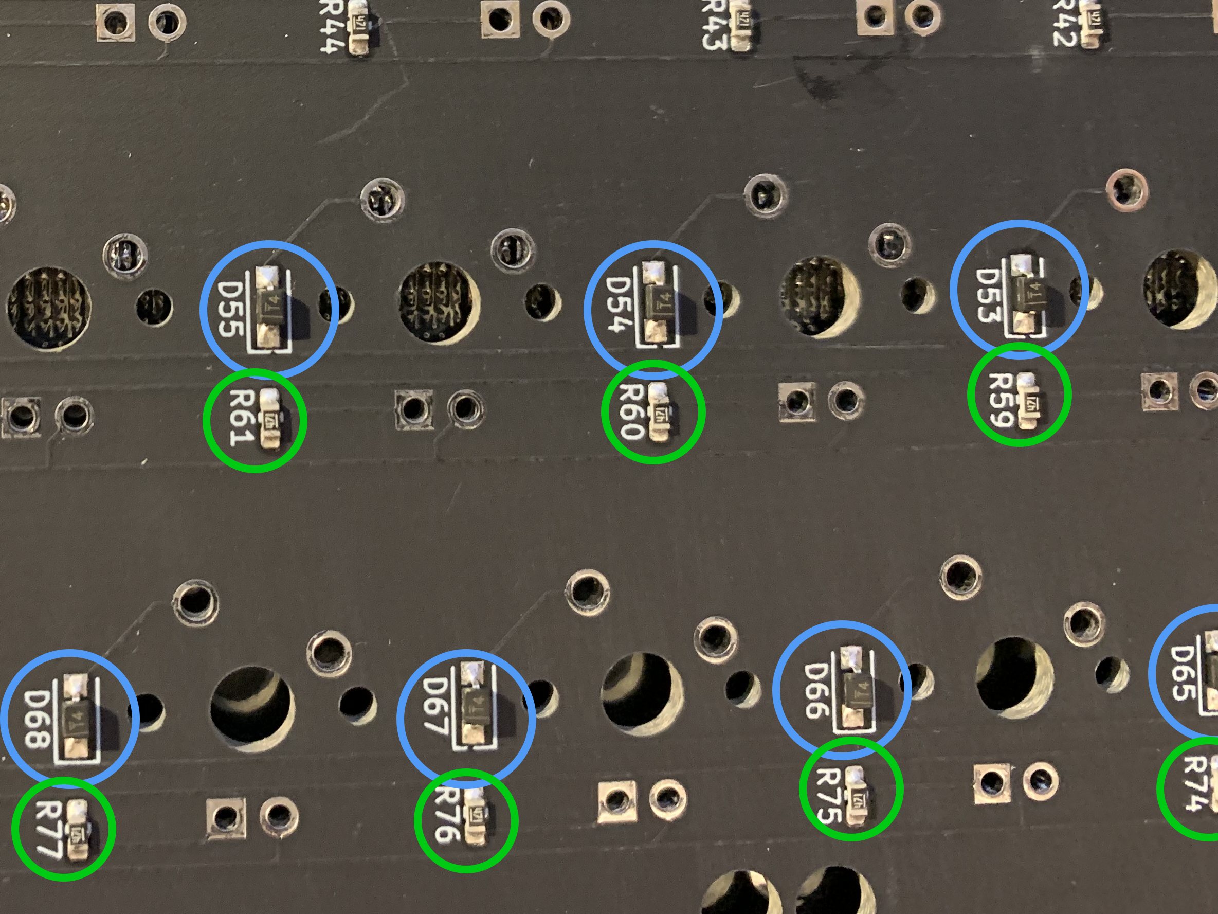 Above image shows diodes (circled in blue), and resistors (circled in green. The square and circle through holes south of switch cutouts are for single color LEDs.